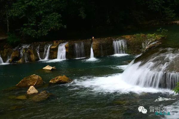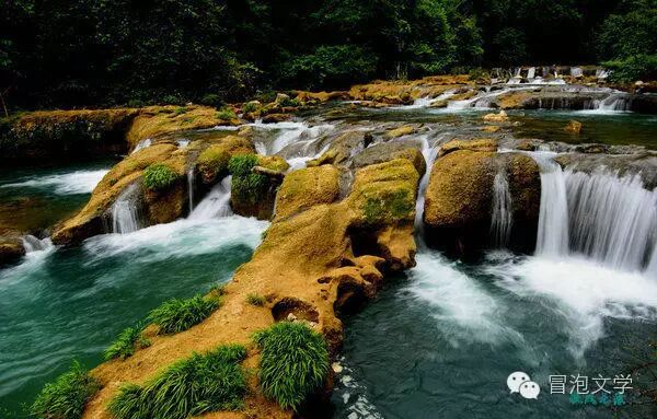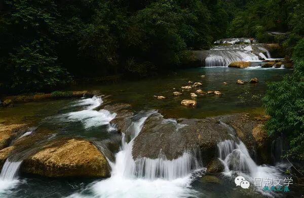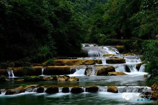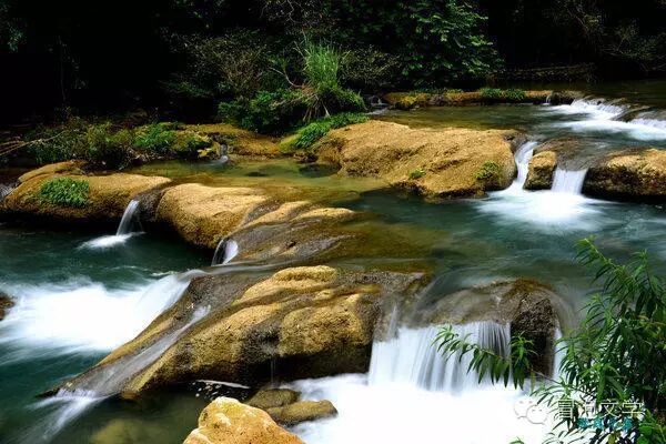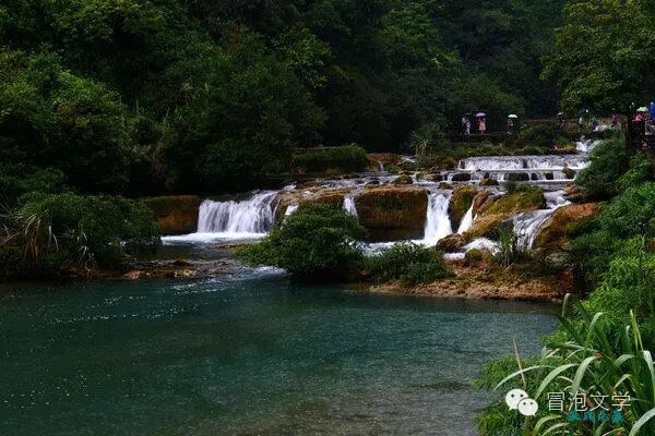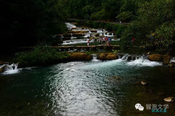 乘车到68级跌水瀑布,我们开始下车欣赏。68级跌水瀑布——涵碧潭上游长1.6公里的狭窄山谷里,沿高高低低的河床,错落着68级瀑布和跌水。层层叠叠的瀑布,淙淙哗哗倾泻而下,或倾珠撒玉,推雪拥云,或如匹练飘逸,似银河泻地,形态各异,气象万千。千姿百态的瀑布跌水竞领风骚,争奇斗妍,构成风情万种的动态水景,令人目不暇接。沿河谷伴梯级瀑布而下,一路但见高山流水、闻泉鸣瀑响、鸟啾虫吟,便油然想起伯牙、子期的知音逸事,更觉眼前诗意盎然,美不胜收。遂为文人墨客冠以“知音谷”的雅号。沿瀑布边下行前往小七孔桥不远旅程,感受的是南国小溪的柔美和台阶瀑布的秀美。
