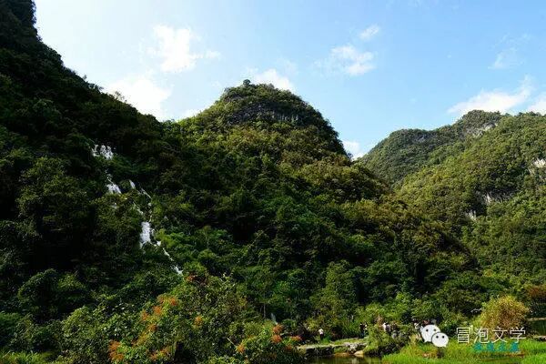 从水上森林乘车到达翡翠谷,这里芙蓉花开,蓝天白云下,绿山之巅,秀美瀑布在绿树间飞泻而下,山根清水成湖,绿草成片,一幅秀美山水,让人们驻足流连。