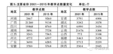 图3:主要省份2001—2015年教学点数量变化 单位:个