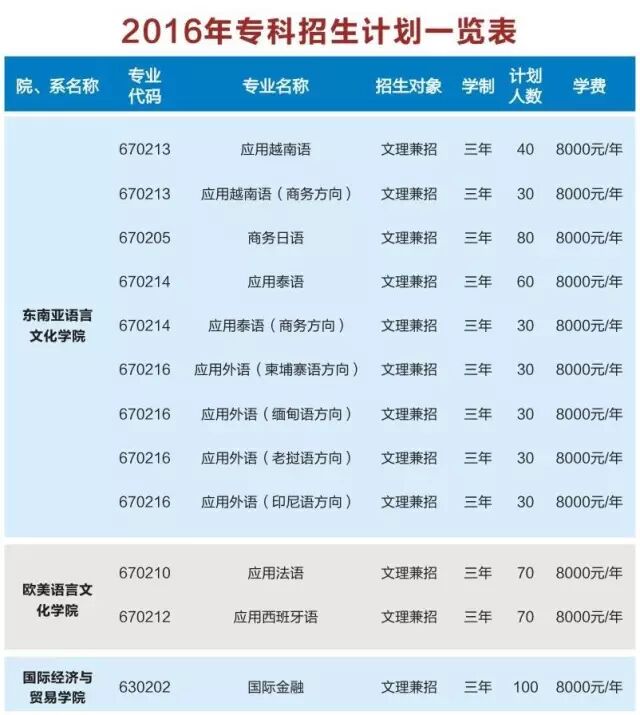 附:广西外国语学院2016年本、专科招生计划一览表