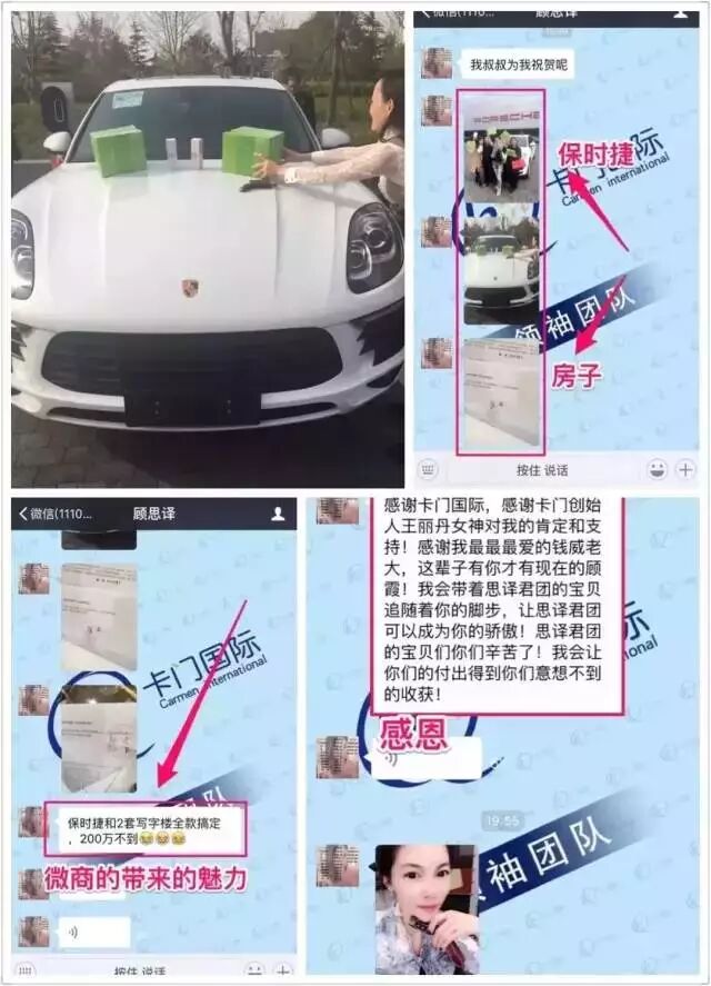 我叫顾霞,在加入【卡门国际】做棒女郎之前,我在美容院工作,一个月也就2、3千块钱,后来知道了【卡门国际】团队,就觉得可以拿600块钱出来试一试,没想到短短几个月时间,我从一个最低的天使代理,做到了核心总代,从一个客户,一个代理都没有,到建立起自己几千人的团队,现在每个月2、3十万的纯收入,并且刚刚买了自己心爱的保时捷跑车,还买下两套写字楼,没有棒女郎,没有卡门国际,就没有我的今天!