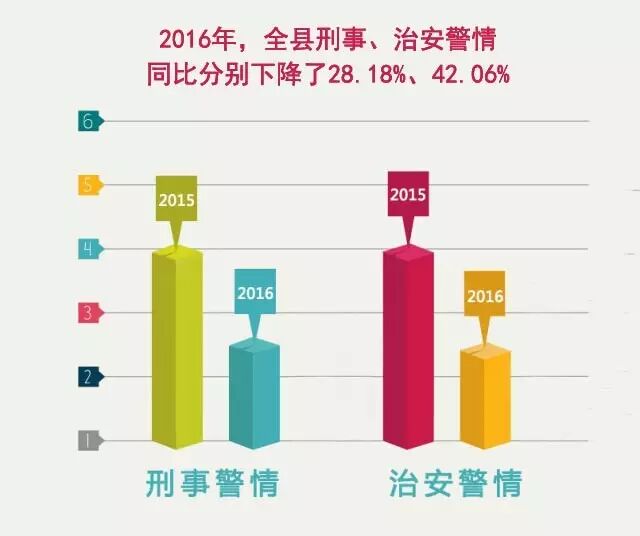 2016年以来全县刑事、治安警情同比分别下降28.18%、42.06%;抢夺抢劫警情下降78.65%、盗窃警情下降65.21%