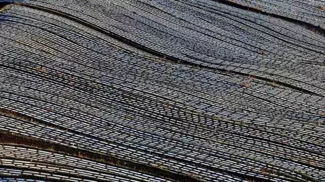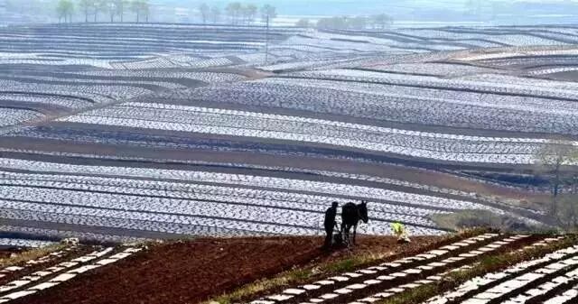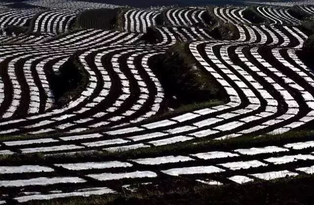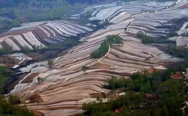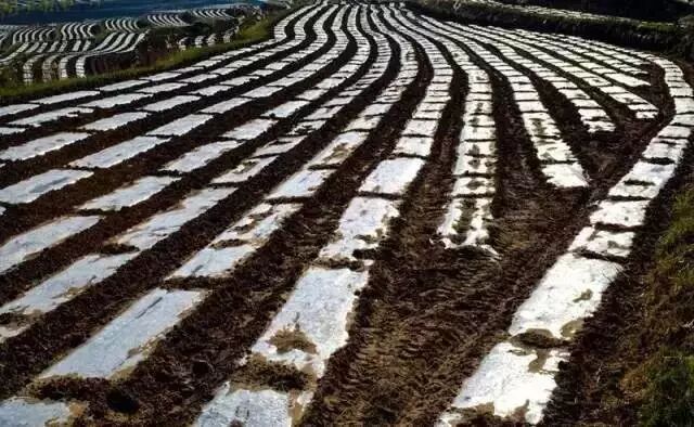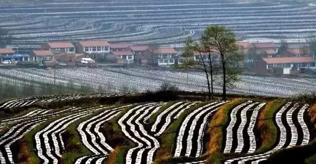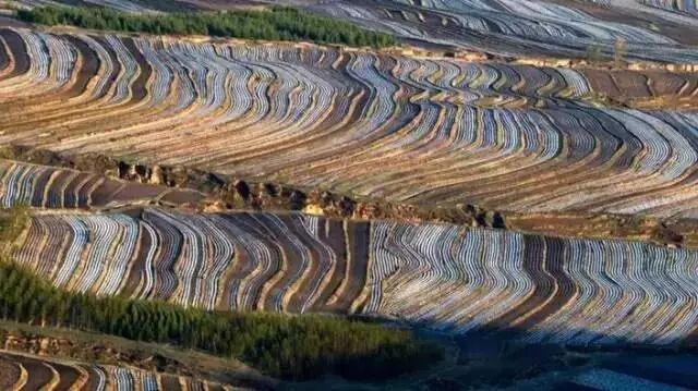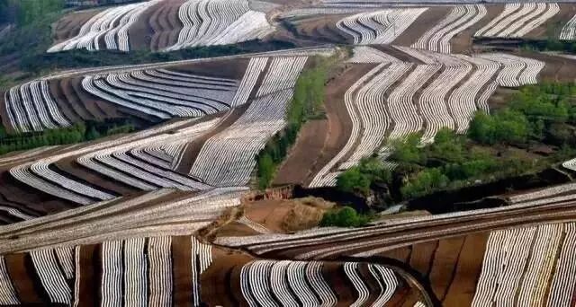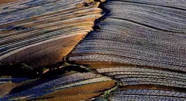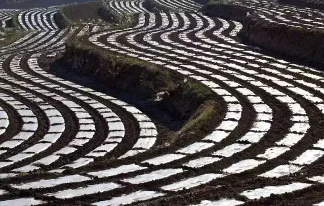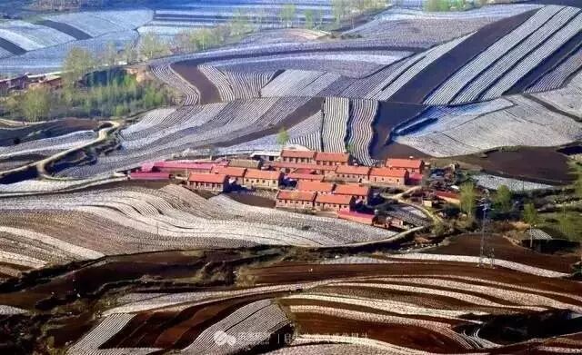 围场梯田最独特的地方,是那一道道如银链般的“白”,从高远处看下去,好似巨龙飞起。和南方水田不同,围场的梯田主要是旱地,种植作物以玉米、马铃薯、谷物和豆类为主,而南方主要种的是水稻。农民在播种时,需要埋下白色的地膜帮助种子生长,种子差不多长起来后要把地膜拱破,这是南方的梯田没有的特殊景观。