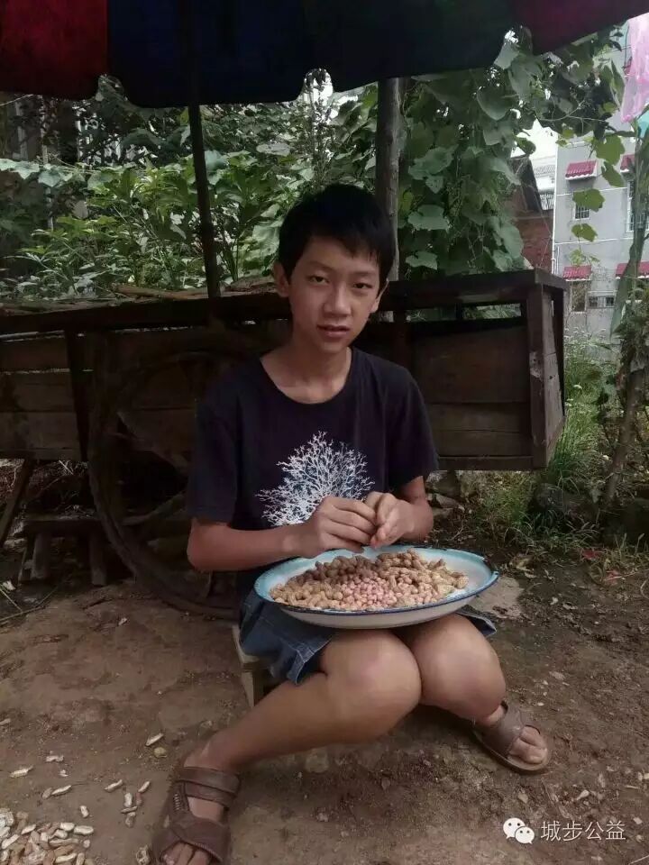 这个帮着母亲剥花生的孩子叫罗俊云,城步县白毛坪乡卡田村3组人,今年13岁,本期即将进入城步县三中就读初一年级。当我们想给他照这个照片的时候,他还连声拒绝,在我再三说明照片的重要性的时候,终于答应进入我们的镜头。8月27日,城步爱心义工雷学品、肖三熊、陈苏梅在白毛坪乡卡田村罗书记的带领下,来到孩子一家临时租住的地方——县城老年科协院子里一栋低矮破旧的小楼里。