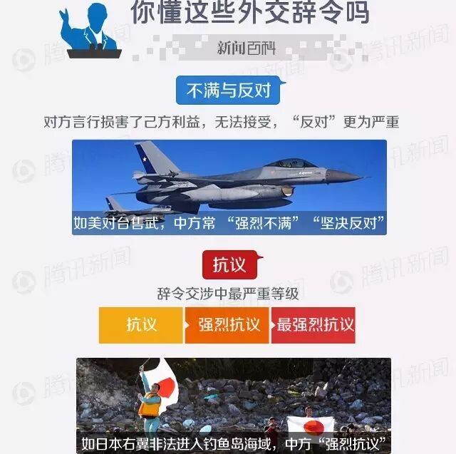 事实上,外交交涉中最常见的表述,依事件的严重程度,主要有:关注/关切、遗憾、不满/反对、抗议等等。其中,“抗议”是最严重等级。而如果“抗议”都还不能完全表达中国的立场,那么还可以在其前面加上“强烈”。