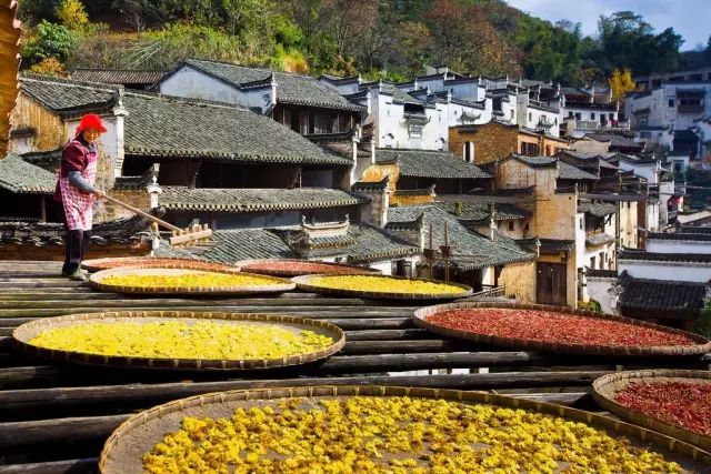 白霭中的村庄充满了徽派建筑的古朴之感,四周环绕的树木高高低低,绵绵的红叶给这幅静默的山水画添上了火热的色彩。