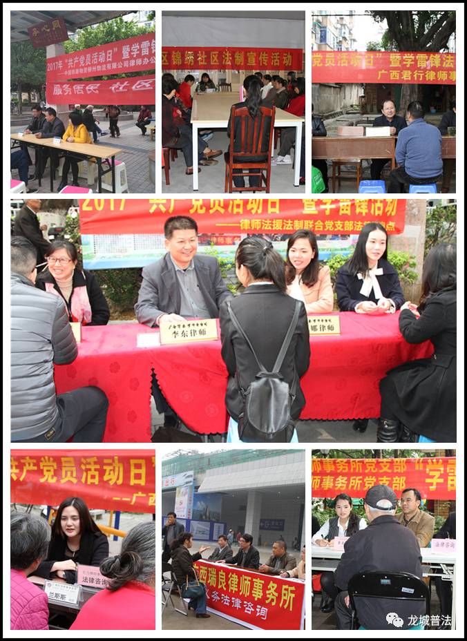 柳州市明桂司法鉴定中心党支部、中铁柳物流公司律师办公室党支部在居上V8城、天鹅湖社区参与了“暖心助残”活动,免费为过往行人测血压、量体重;超仁律师事务所党支部组织本所6名律师党员为因父瘫痪导致休学的广西中医学院融安籍大三女生莫某捐款7398元;。