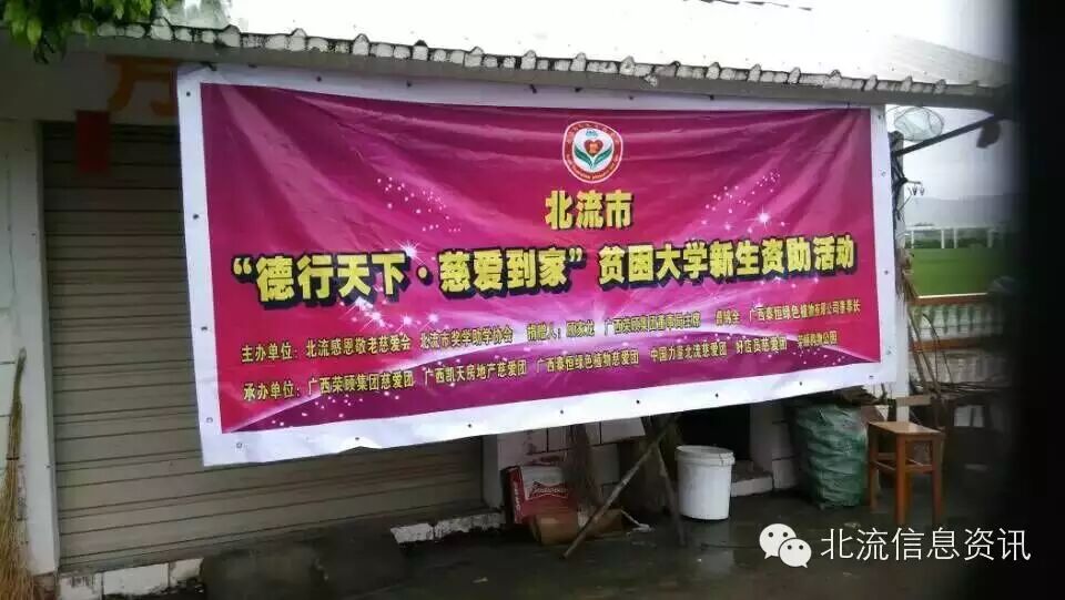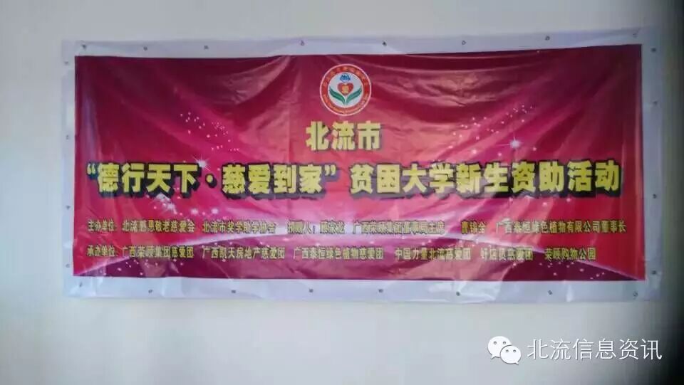 由北流感恩敬老慈爱会、北流奖学助学协会主办,由广西荣顾投资集团董事局主席顾家龙捐资4万元,广西泰恒绿色植物有限公司董事长曹锦全捐资1万元,于8月30日-31日,由北流感恩敬老慈爱会及青年创业联盟慈爱团、好店员慈爱团、北流中国力量慈爱团等单位组成团队到农村23个特困新生家里祝贺,了解学生家庭情况,并分别为学生发放了2000或3000元助学金,送去了商家和爱心人士的一片深情厚意,人到、情到、资金到。受助学生还签了接力慈善承诺书,北流爱心人士的这次活动受到了社会各界的高度赞美.