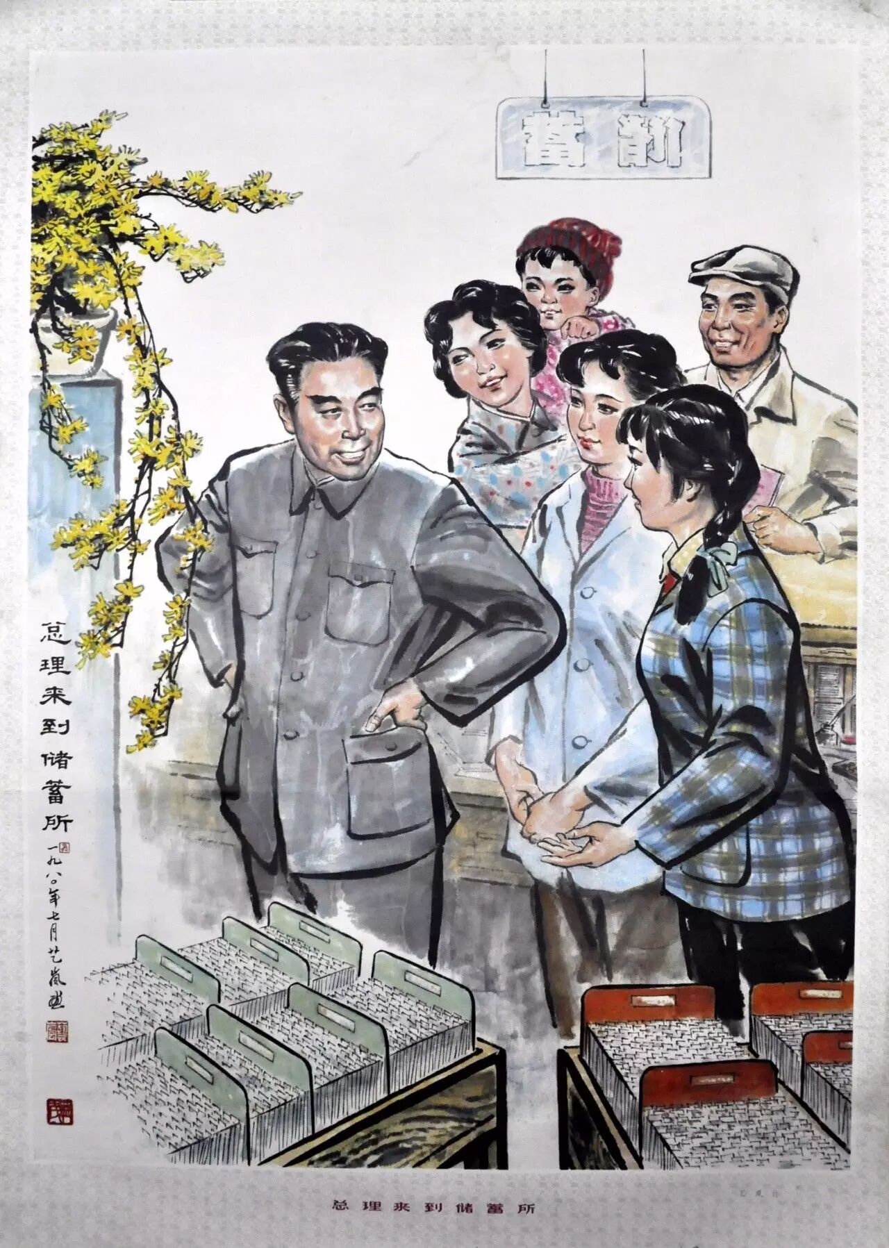 手头的这幅《总理来到储蓄所》,让我眼前一亮:领袖题材的宣传画,本来就是藏家追捧的热门,而伟人与银行相关的作品,更是难得一见,弥足珍贵啊。画面中的,以他招牌式的叉腰动作,跟储蓄所的工作人员亲切攀谈,狭小的空间瞬时如沐春风,充满了温馨感人的气息。