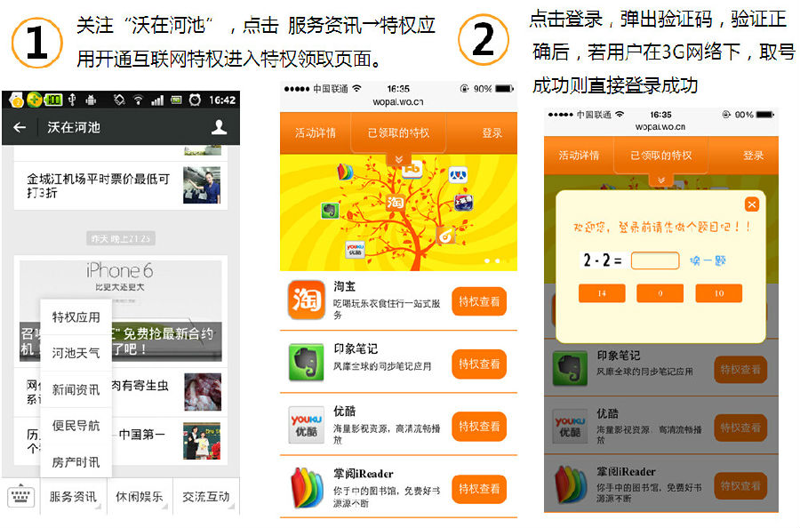 第一步:关注“广西联通微订购”,点击“微订购”→“特权应用”进入特权领取页面。