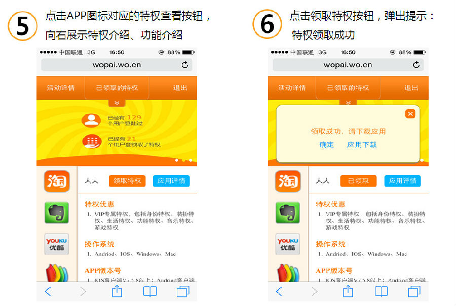 第六步:点击领取特权按钮,弹出提示:特权领取成功。