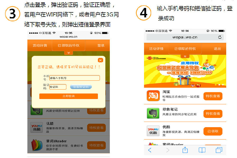 第三步:点击登录,弹出验证码,验证正确后,若用户在WIFI网络下,或者用户在3G网络下取号失败,则弹出短信登录界面。