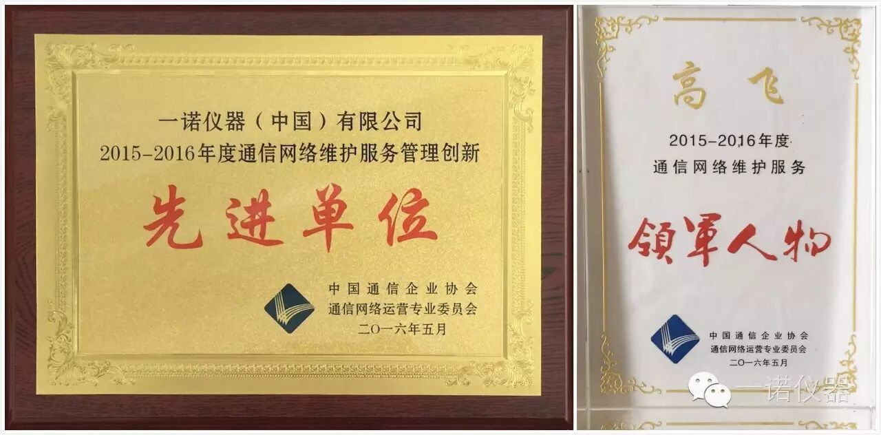 2016年5月,以“融合创新、变革发展”为主题的年度中国通信网络运维服务高级研讨会在湖北武汉举行,在同期举办的推进活动中,一诺仪器斩获“2015~2016年度通信网络维护服务管理创新先进单位”荣誉,副总裁高飞先生则荣获“2015~2016年度通信网络维护服务领军人物”奖项。