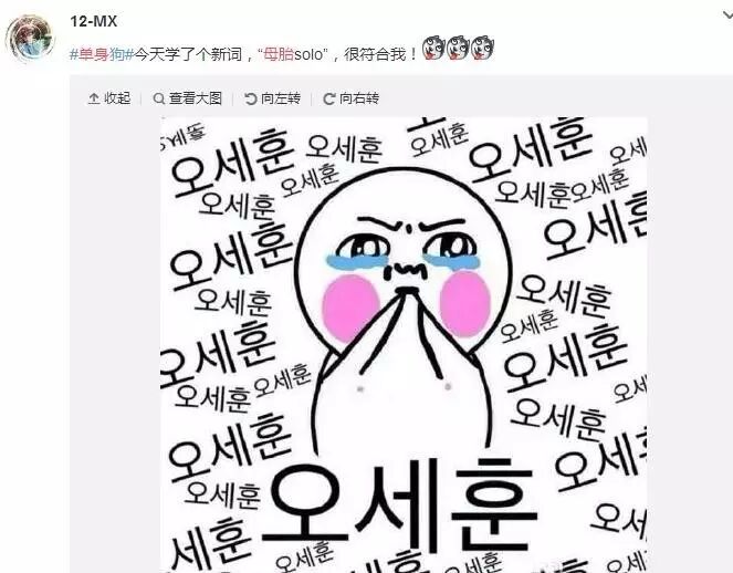 在韩国,把年龄=单身时间的人称为“母胎solo”,也叫母胎单身,比喻一个人从来没谈过恋爱。一开始这个词在韩国娱乐圈广泛使用,后传到微博,追星族常用,也可用来吐槽自己单身。