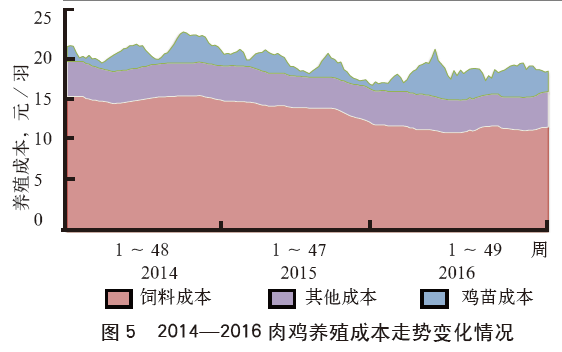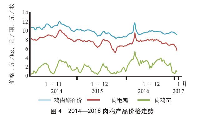 在祖代鸡引种量持续下降的背景之下,市场对鸡肉供应量下降抱有强烈预期。因2015年9—11月行情持续较差,种鸡普遍提前淘汰,2016年1季度可供出栏鸡只量大幅下降,屠宰场库存下降,市场抢货,鸡肉产品综合售价跳涨,3月份,鸡价一度冲至10元/kg,鸡苗涨至6元/羽,带动市场积极性,商品鸡苗价格长期运行于3~4元/羽。但由于终端市场需求并未跟上,2016年全年,鸡肉价格长期运行于9.5~10.0元/kg,鸡价运行于7~8元/kg(图4)。
