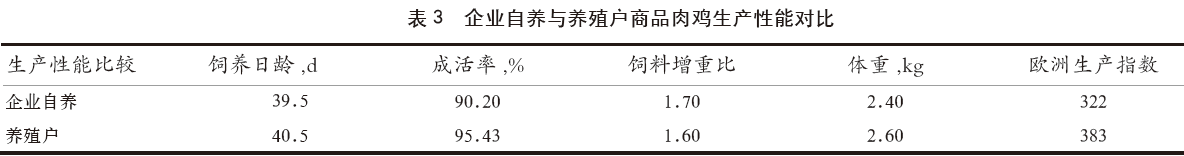 根据对不同规模养殖户的跟踪调查,2016年,年出栏5万~20万羽养殖户/合作社肉鸡出栏量较2015年同期持平或略增,平均批次仍为5.5批。在养殖方式上持续网养改笼养趋势;河北及山东部分区域约5%~10%的养殖户由养白羽肉鸡改养黄羽肉鸡或817肉杂鸡;在博亚和讯定点跟踪的养殖户中,10%养殖户扩大了2016年肉鸡饲养量。由表3可知,当前养殖户肉鸡生产性能较企业自养有明显优势,一体化企业在自养肉鸡的饲养管理上仍有提升空间;另外,当前公司新建项目较多,“公司+农户”生产模式仍有不可替代优势。