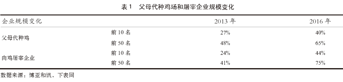 2013—2015年,白羽肉鸡产业以亏损为主,中小散户不可逆地加速退出,产业集中度提升,完成了一波压缩产能的过程。2016年父母代种鸡场集中度提升明显,前10名父母代种鸡场父母代种鸡存栏占比达40%以上,前50名父母代种鸡场占比高达65%(表1)。据调查,2016年前50大肉鸡生产公司的肉鸡屠宰量较2015年提升9%。