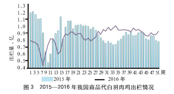 因祖代、父母代强制换羽,2016年白羽肉鸡商品鸡苗降幅有限,实际产量48.67亿羽,同比下降2%。2016年商品鸡出栏量44.9亿羽,同比下降5.7%,其中上半年出栏20亿羽,同比下降19%;从8月起,商品鸡出栏量较上年同期增加,下半年肉鸡出栏量24.9亿羽,同比上涨11%。2016年商品鸡出栏体重较2015年小幅下降,鸡肉产量818万t,同比下降7%(图3)。
