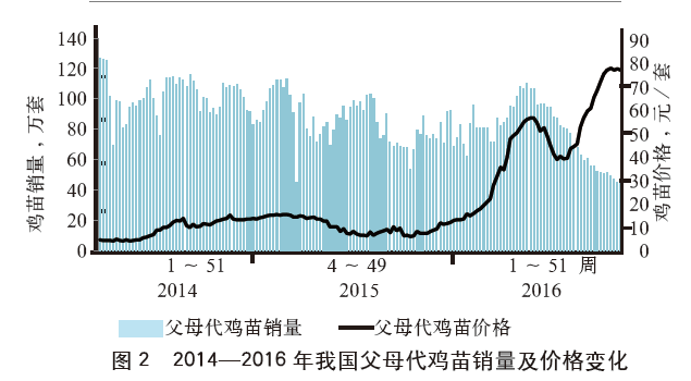2016年,祖代鸡理论产能同比大幅下降,但父母代鸡苗需求向好,销售率提升19%达99%,据博亚和讯测算,2016年常规在产祖代鸡提供父母代鸡苗3 106万套,强制换羽祖代鸡提供1 060万套,共计4 166万套,同比下降6%。不过因2015—2016年祖代鸡引种不均衡,父母代鸡苗产量分布不均,市场需求转好,价格大幅上涨,全年均价高达43.45元/套,较上年同期增加350.73%(图2)。