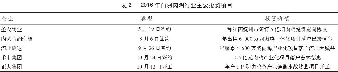 由表2可知,因行情回暖,2016年白羽肉鸡大企业陆续投资新项目。