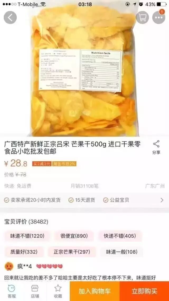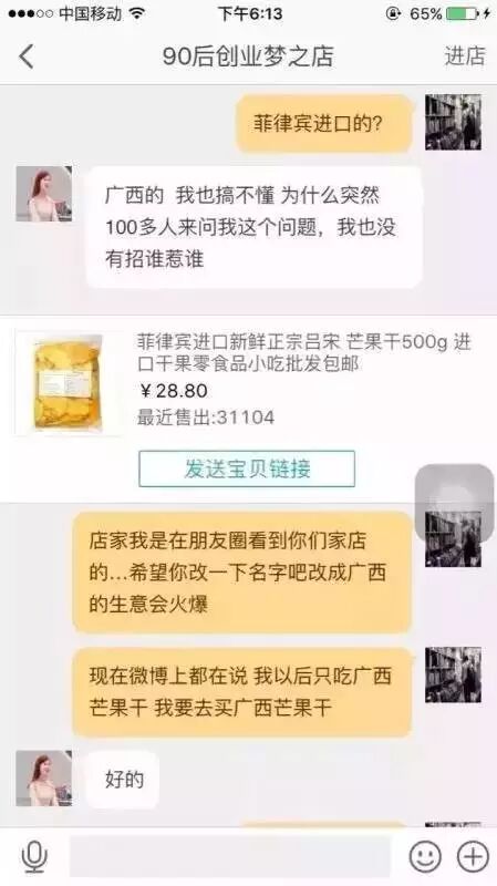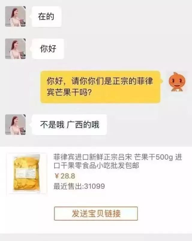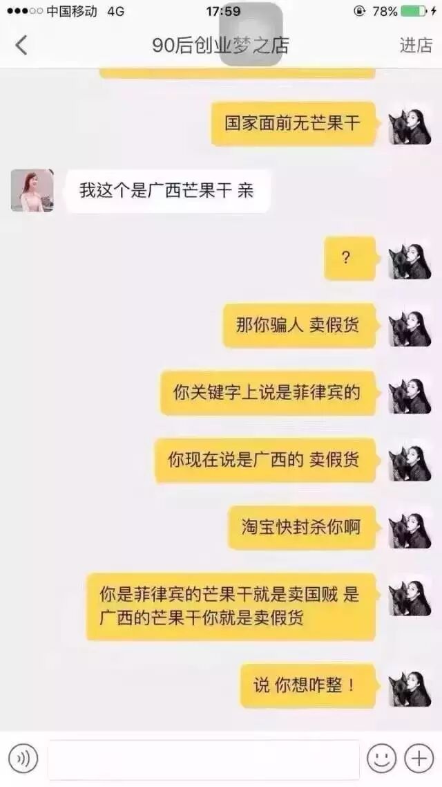 有位卖芒果干的小姑娘,起初说自己卖的是正宗菲律宾芒果干,被网友质疑后,立马端正态度:宁卖假货,绝不卖国!