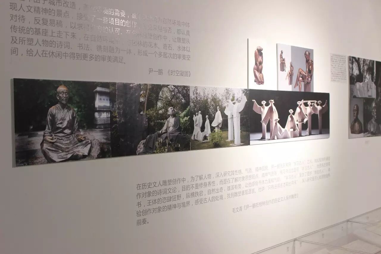 除了案头瓷塑,先生还在全国多地尤其为家乡桂林创作了一批作为城市公共雕塑的历史名人塑像。先生一生致力于雕塑民族化、公共化的实践研究,留下了大量公共雕塑作品和宝贵的第一手资料。直到尹先生去世之前,他一直都没有停止过雕塑的创作。这些匠心独运并充满艺术魅力的雕塑,凝结着他对先贤、家乡和土地的真挚感情。它们不仅与空间环境交融为一,也把先生的英名和创造之迹镌刻在这片养育他的土地上。