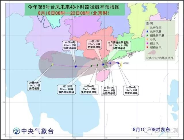南海热带低压已于18日早晨5点钟在南海西北部海面上发展为今年第8号台风(热带风暴级,暂无名),上午9点钟其中心位于广东湛江以东大约150公里的海面上,就是北纬21.0度、东经111.8度,中心附近最大风力有8级(18米/秒),中心最低气压为985百帕,7级风圈半径70-150公里。