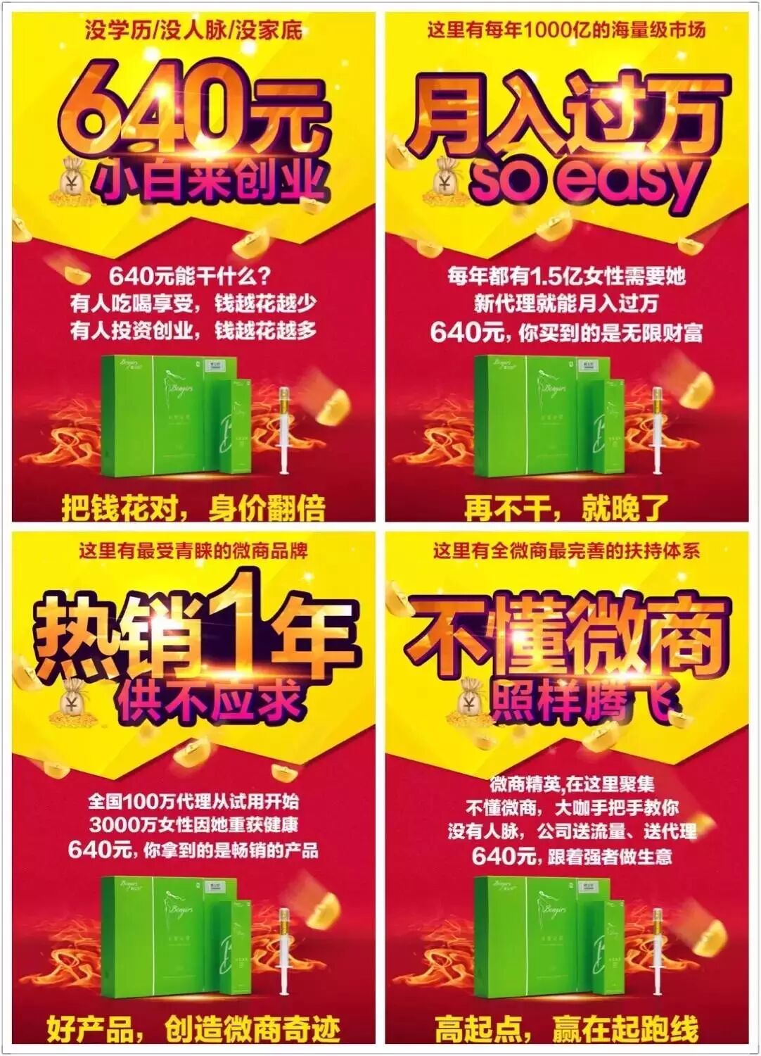 低门槛加入——640元做代理,超低门槛,却能跟随专业微商团队,帮扶你快速成功,没有卖不出去的产品,只有不会做销售的人,今天你是小白,明天就可能是微商大咖。