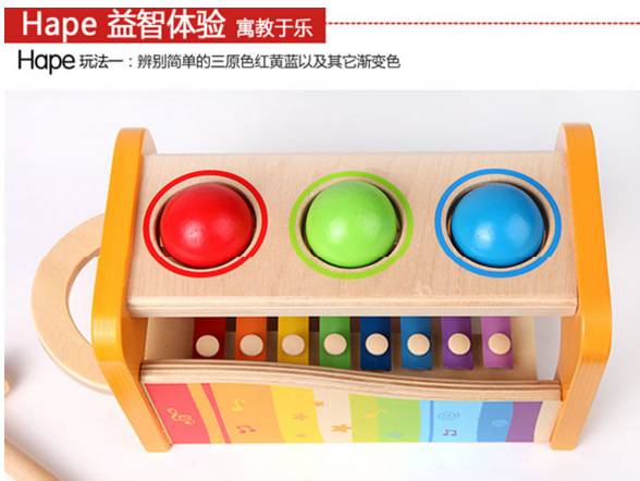这款玩具有8色8音阶,让宝宝试着通过颜色去区分音阶,从中感受色彩与音色的艺术张力。榔头可双面敲击,以实现不同的功能。扁的一面是拿来敲小球的,另一圆面试敲木琴的。