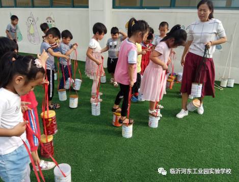大一班展示的是“高跷”,玩法有三种:1、让小朋友们踩着铁罐,拉着铁罐上的尼龙绳,控制自己的脚步,看谁走得远。 2、可以把铁罐放在地上摆成各种形状,小朋友踩在铁罐行走。训练幼儿的灵活性。3、幼儿在教师的引导下寻找探索新的玩法。通过踩高跷活动,锻炼了孩子的平衡能力和灵活力,提升孩子的勇气和胆量。