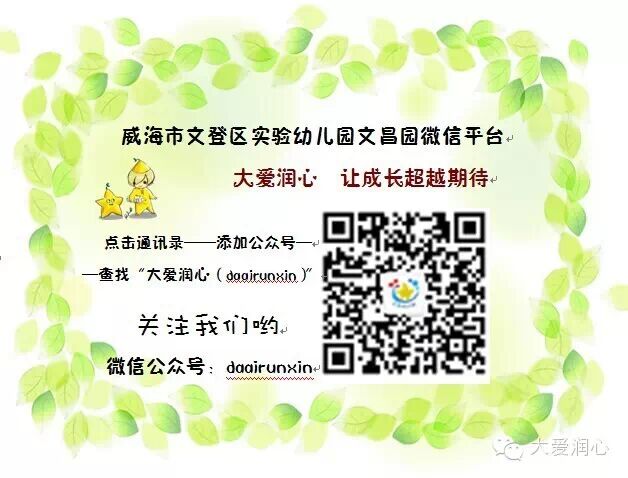 温馨提示:请关注文登区实验幼儿园文昌园的微信公众号“大爱润心",可快速关注;点击右上角,可将好文分享到“朋友圈”或“收藏”点击左上角返回,可查看历史消息。