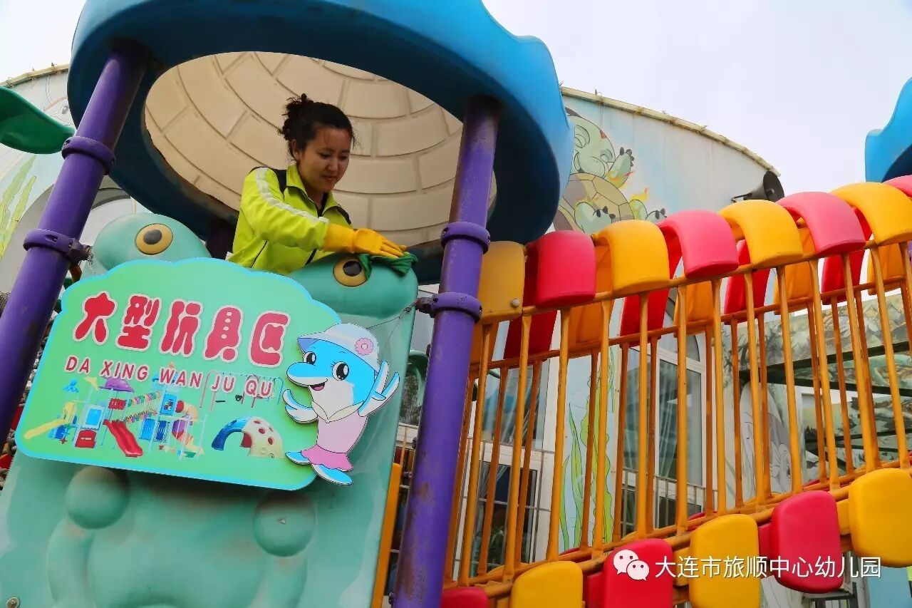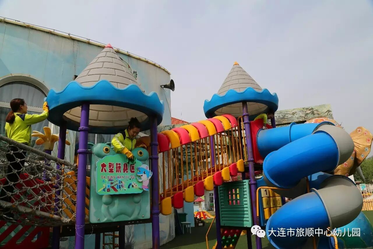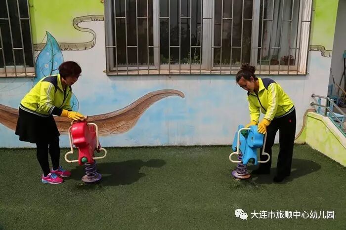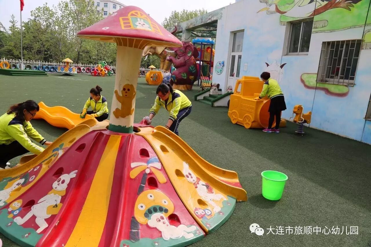 春末夏初是幼儿传染病的多发期,旅顺中心幼儿园为了给我们的宝贝提供安全、整洁、干净的活动场地,加大了预防传染病工作力度。在每日消毒的基础上,组织教师开展户外大型玩具安全隐患排查及清洁消毒工作。