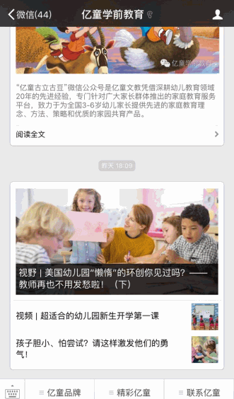 喜欢亿童学前教育微信公众号每日推送的文章吗?那就将它置顶吧!找到亿童学前教育微信公众号,进入公众号点击右上角,选择开启“置顶公众号”即可~
