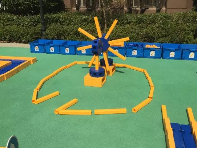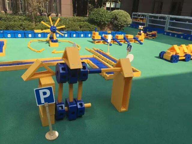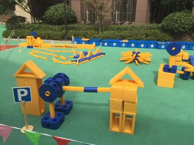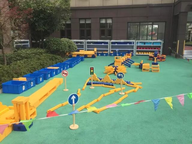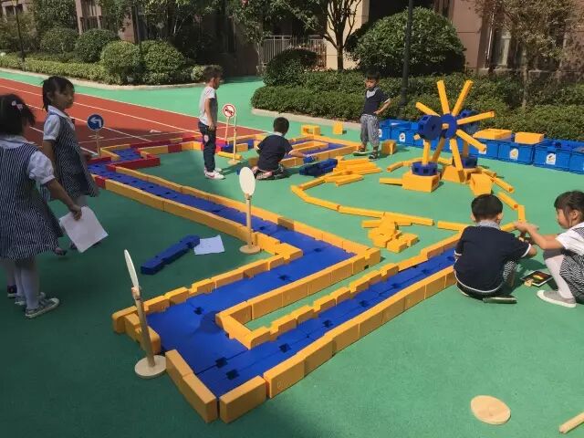 由于场地的限制,孩子们运用材料时的灵活性不够,针对这一问题,老师们将所有的建构材料搬到了户外,开阔的空间让孩子们可以更加自由地搭建,进一步探索材料的新玩法。