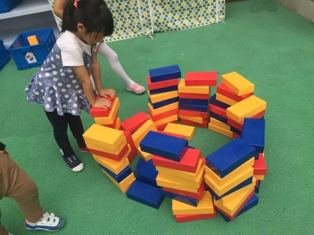 在这次的建构游戏中,孩子们学会了发现问题、解决问题。例如:在搭建蹦床的过程中,孩子们一开始用垒高的方式搭建,可是轻轻一碰,蹦床就倒了。后来,他们试着把积木叠整齐了往上垒高,还是不够牢固。在一次又一次的调整后,最终他们用交错式的方式完成了蹦床的搭建。