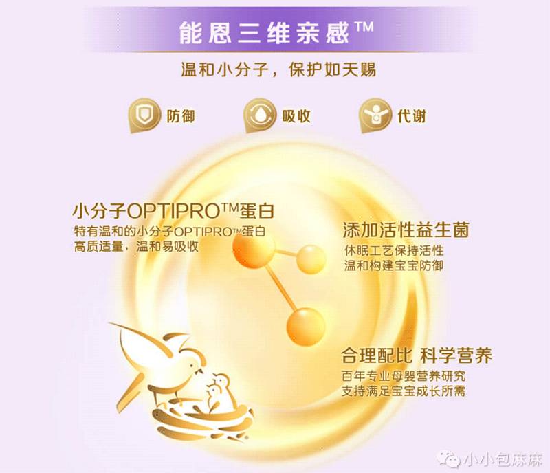 适度水解配方将大分子分散成了小分子,其实就像将蔬菜打成蔬菜泥,营养成分不降低,而超级能恩中OPTIPRO小分子蛋白可以在母乳不足时,给予婴儿三大系统(消化、免疫、代谢)温和的训练,帮助婴儿三大系统成熟。小分子蛋白好消化易吸收,适合宝宝娇嫩肠胃。