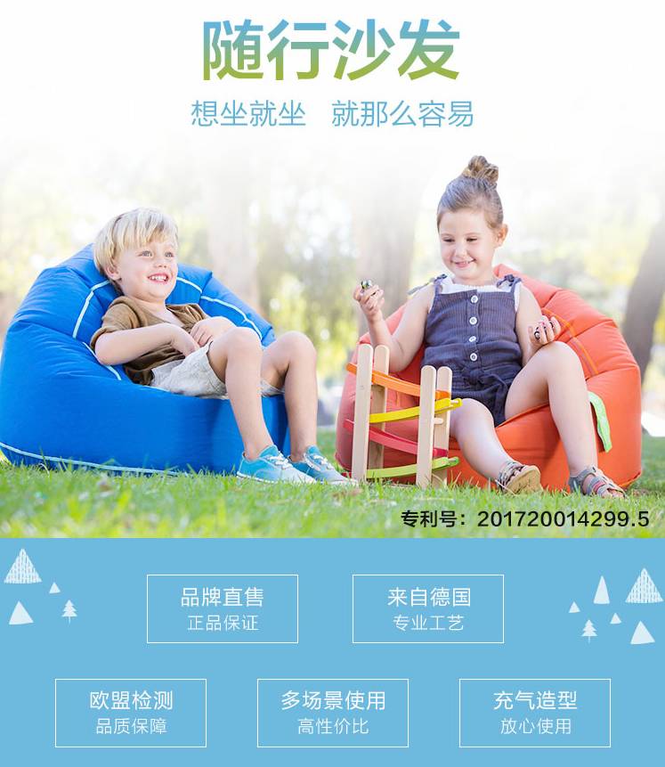 这款沙发不用充气泵、打气筒,而是撑开兜风口,转个圈就可以了!沙发同样采用TPU材质,重量非常轻,孩子自己也可以完成充气;而且折叠后只有成人小臂大小,还配有收纳袋,携带非常方便。每次打开沙发进行充气都充满乐趣!(下文有视频)
