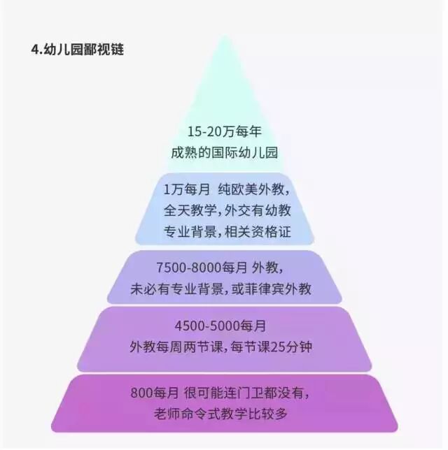 “我坚持面试全程和老师用英语交谈,因为这样我就能发现,哪些幼儿园的老师发音标准、语法正确,哪些是糊弄事儿的。”王富贵的妻子说,外籍教师的资质也是她的关注重点,外教必须通过国际相关幼儿教育机构考核,最好来自母语为英语的欧美发达国家,东南亚国家的英语外教只能是备选项。在她看来,有的幼儿园聘用一些毫无幼教经验的普通外籍人士,只是为了他们那一张“外国人的脸”。