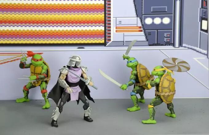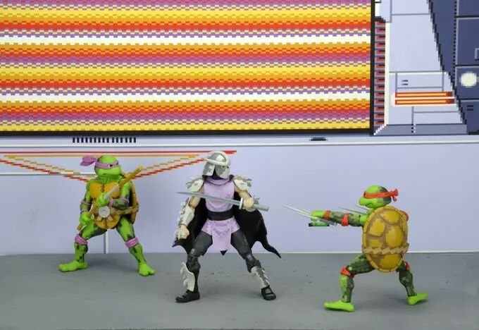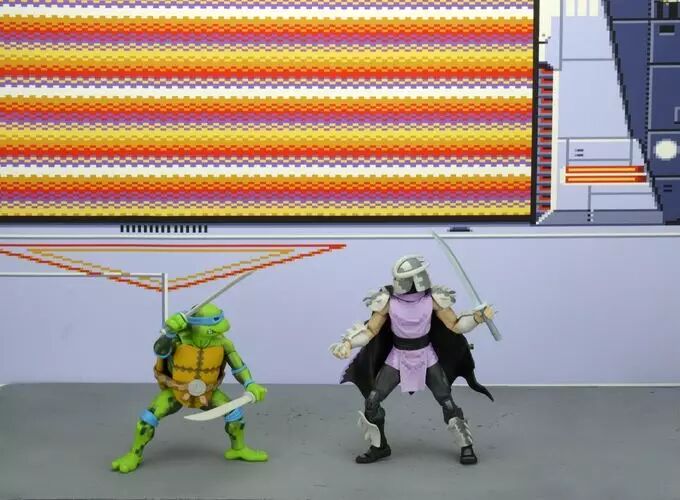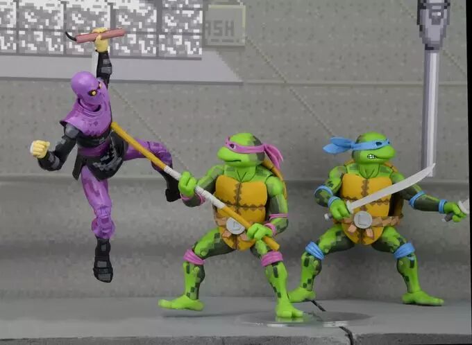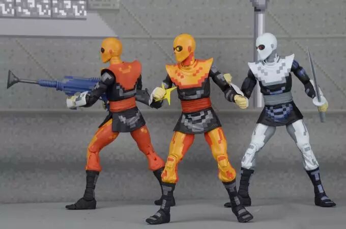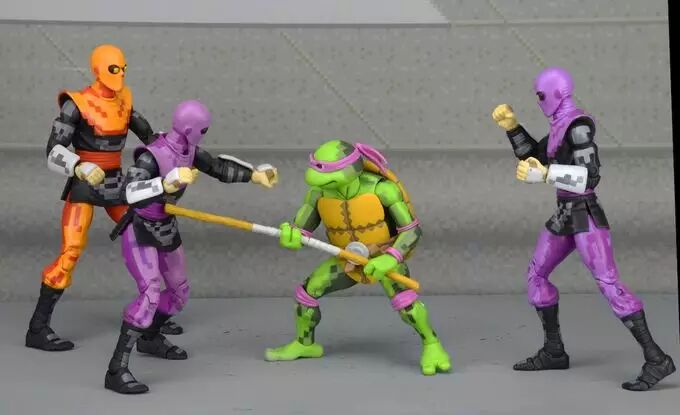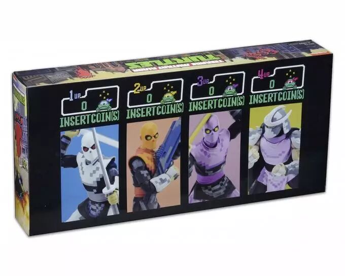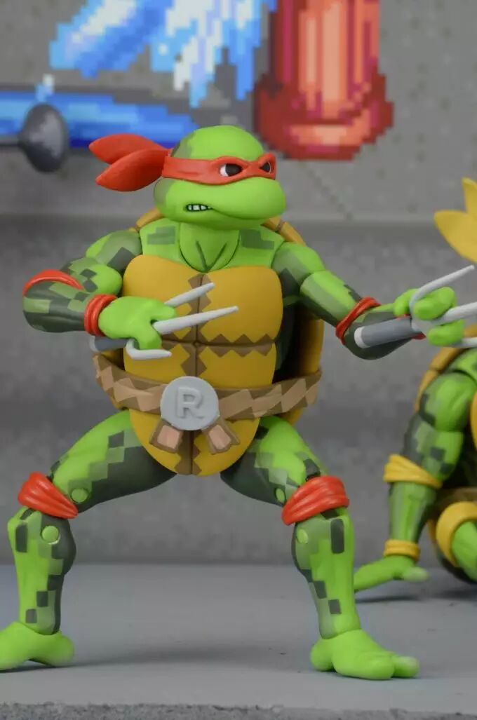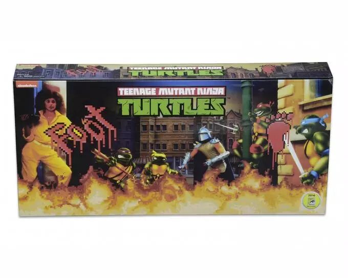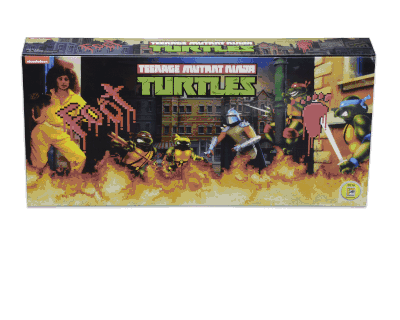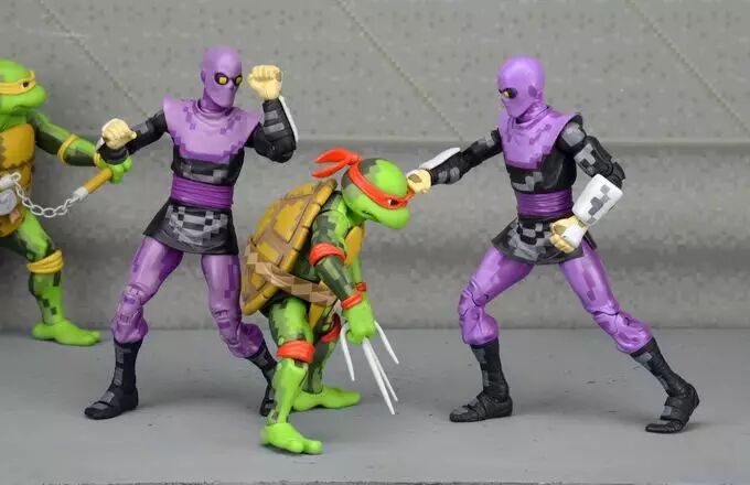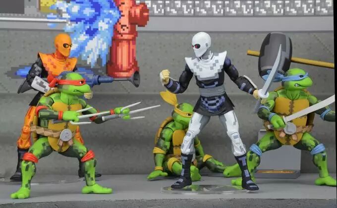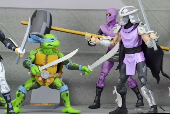 近年来,美国玩具商NECA将蝙蝠侠和魂斗罗的游戏形象纷纷玩具化,在玩具本体上涂装马赛克状的方块以凸显像素游戏的元素,意图靠怀旧题材来吸引业已成年的玩家们。临近SDCC 2016,NECA爆出了让忍者神龟迷们兴奋的消息——将89年诞生于街机上的初代《忍者神龟》游戏也玩具化了——当然,是会场限定版。