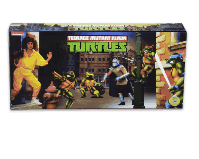 这套游戏版忍者神龟6寸可动人偶包装正面采用街机框体当年的招牌画,背面则采用的是游戏的选人画面。