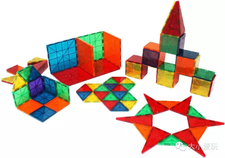 特点:就是在几片不同大小形状的薄薄的塑料的边上加了一圈磁铁,仅此而已。但是!就是由于有这一圈磁铁,三维变成了可能!可以用简单的几个形状比如三角形,正方形拼出三角锥,正方体,球形,城堡等等。
