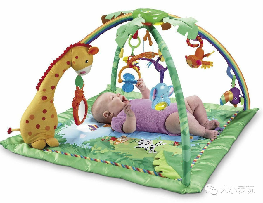 特点:外观设计多彩、舒适,支架上有好几种雨林动物吸引宝宝来抓握和蹬踹。还能播放各种轻柔音乐,为运动增加趣味性。