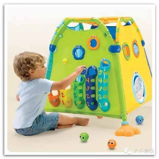 特点:美国品牌。帐篷的四壁上有可以藏猫猫的小洞洞,有学数数、认颜色的5个长短不一的桶,可以让宝宝根据数字和颜色放入对应的滚球。还有5把不同颜色形状的钥匙,能打开不同的小窗户。可折叠、拆卸,不占空间。