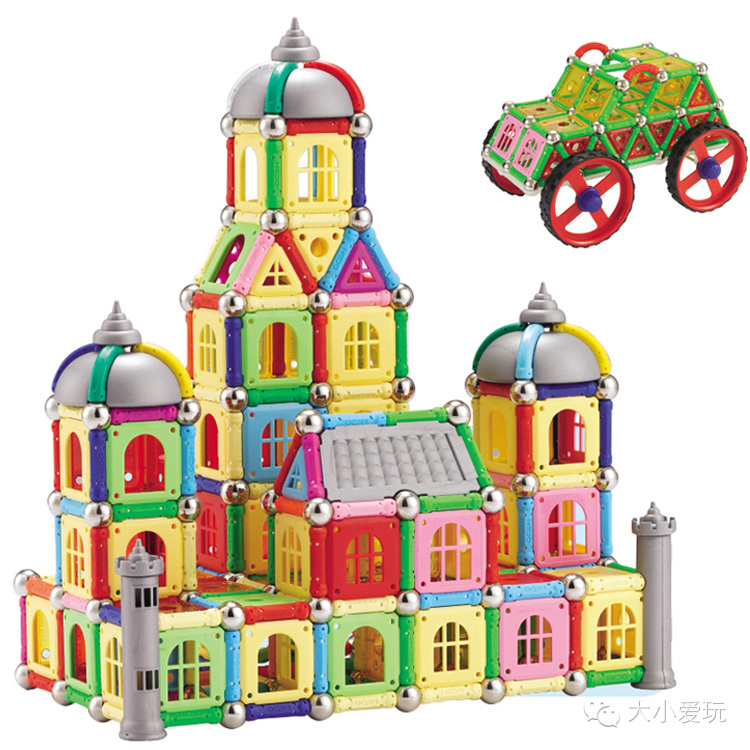 特点:磁力棒系列玩具可以开启儿童智慧,采用强磁性棒及金属球进行任何组合、拼接,由于磁力的作用,他可以把球和棒紧紧吸住,因此,可以用它制造各种结构:如桥梁、房屋、数学模具、物理模具、化学模型、几何模型。只要有充分的想象力,可以拼接想象中的任何结构。