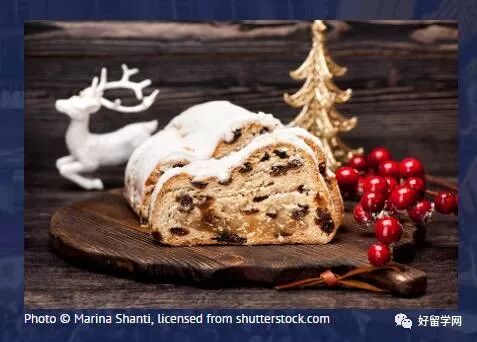 Stollen德国圣诞蛋糕的历史可以追溯到中世纪的。 蛋糕有着独特的形状,它由面粉,黄油,葡萄干,杏仁,小杏仁饼,蜜饯皮,水,酵母,盐,香料和朗姆酒制成。Stollen可以保存好几个月。 吃的时候,它应该切成片,并配着黄油或奶油。 加上一杯咖啡或茶,这是寒冷冬日里最美味的温暖。