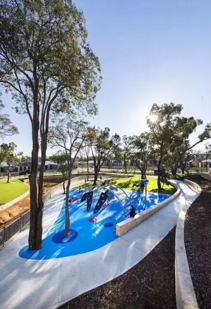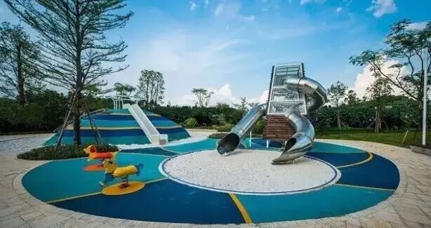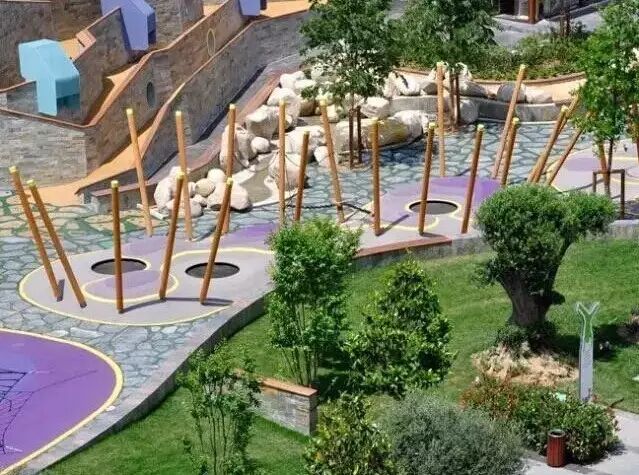 水体设计一般主要采用自然式,自然的岸线和驳岸对于各种年龄的孩子来说都是可以训练动手操作能力的环境,水不能过深,按年龄或身高设不同深浅(20cm-50cm)的水池,以确保儿童的安全。沙地是儿童锻炼塑造能力以及耐力等的重要场地,往往与水体相结合。