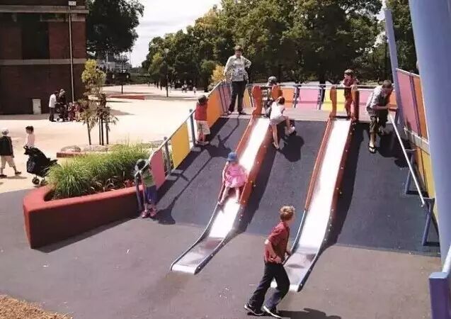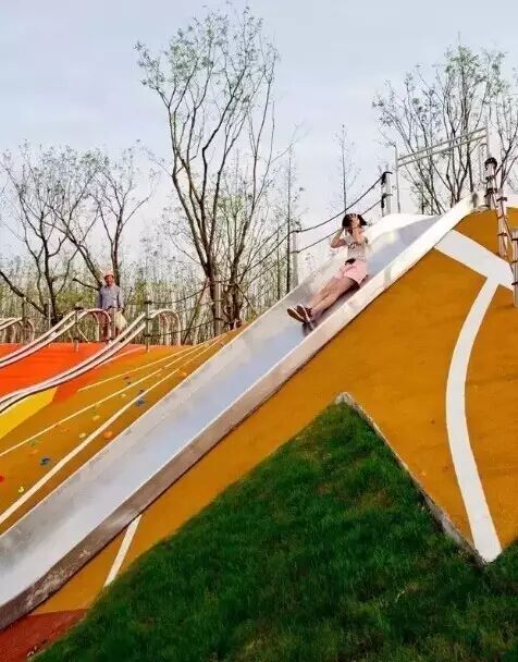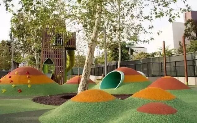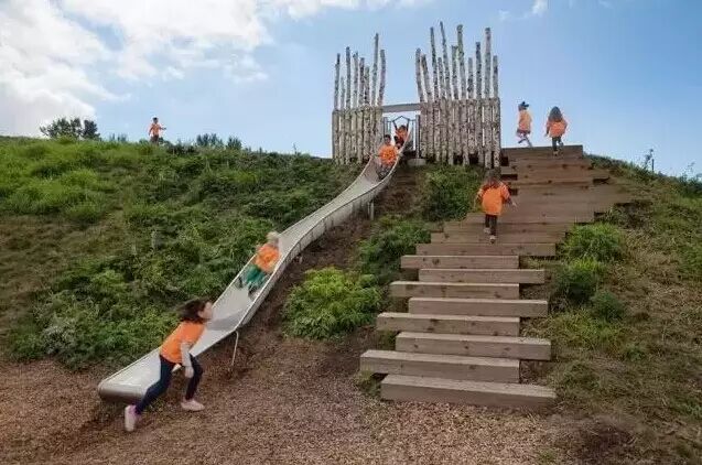 变化的地形能让孩子们在上面打滚、俯冲、滑行、躲藏等而令他们感到惊奇,因此在设计中可利用和加强现有的高程变化的地形,或是人为造成起伏变化的地形。如果坡度有陡然的变化,可考虑利用地形设计滑梯,平整的地面可用于体育运动场地。