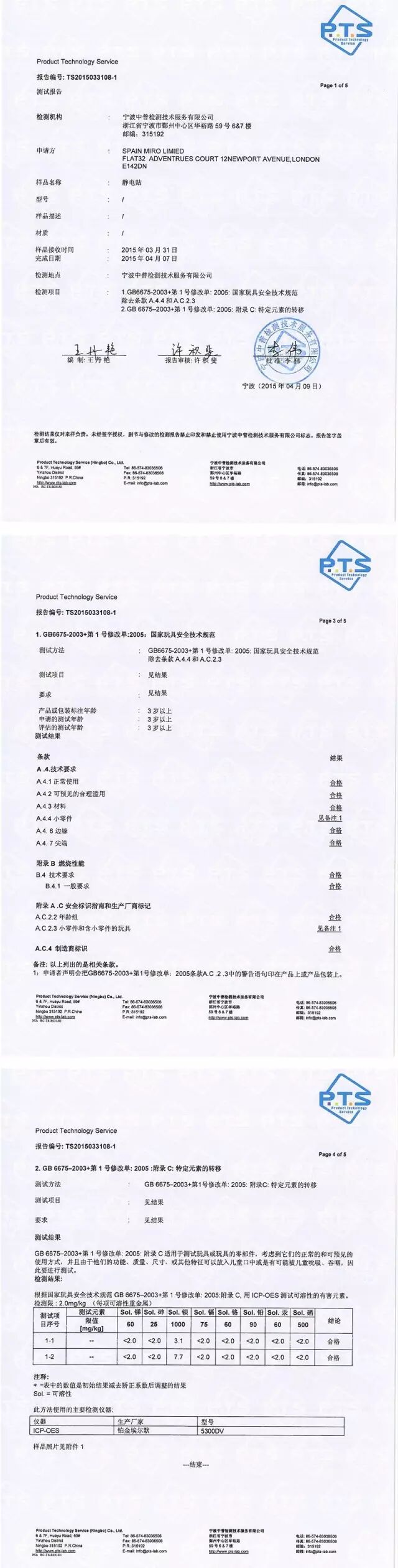 这套静电贴的质量检测证书如下。