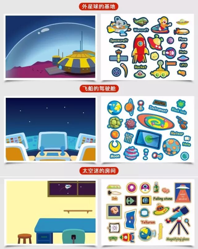 太空探索主题我个人也特别喜欢,每个孩子都有一个太空梦,贴纸展示的场景图非常棒,孩子能玩很久都不厌倦。