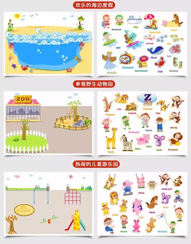 在玩这个主题的时候,可以和生活中的体验联系起来,比如“欢乐的海边度假”,有阳光、沙滩还有小贝壳儿。
